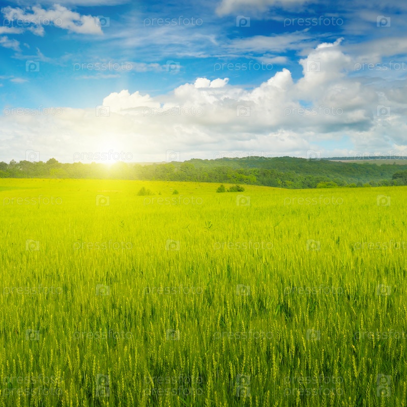 Поле и восход солнца в синем небе