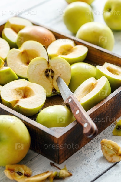 Нарезанный зеленые яблоки в деревянном ящике