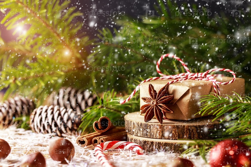 Рождественский узор со снежинками, еловыми ветками и рождественским подарком