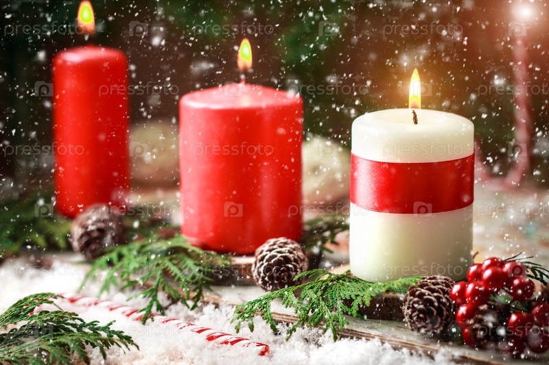 Рождественская открытка с горящими свечами и украшениями