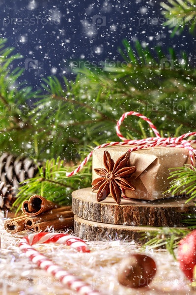 Рождественский узор со снежинками, еловыми ветками и рождественский подарок