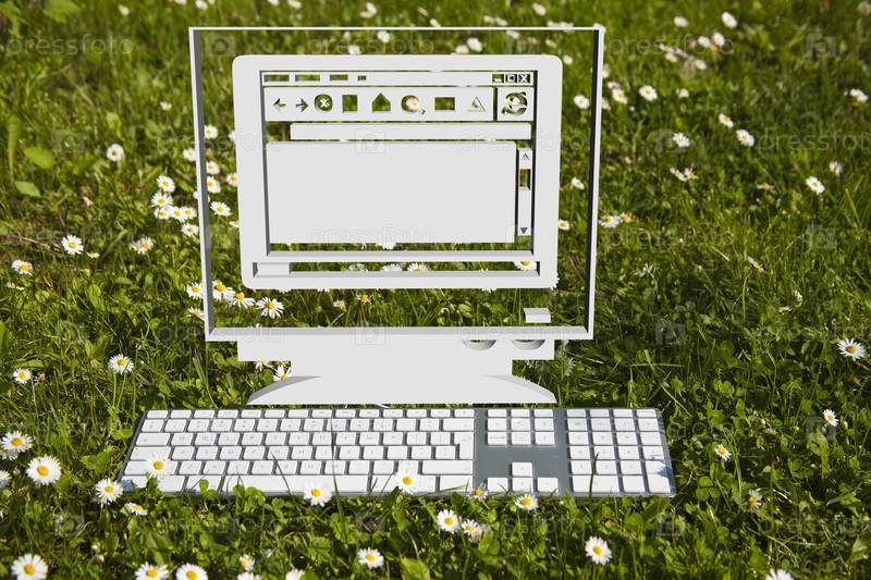 Компьютер и современная клавиатура на зеленой траве в саду