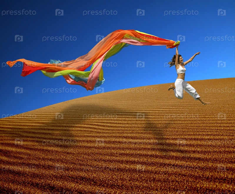 Женщина прыгает через дюну