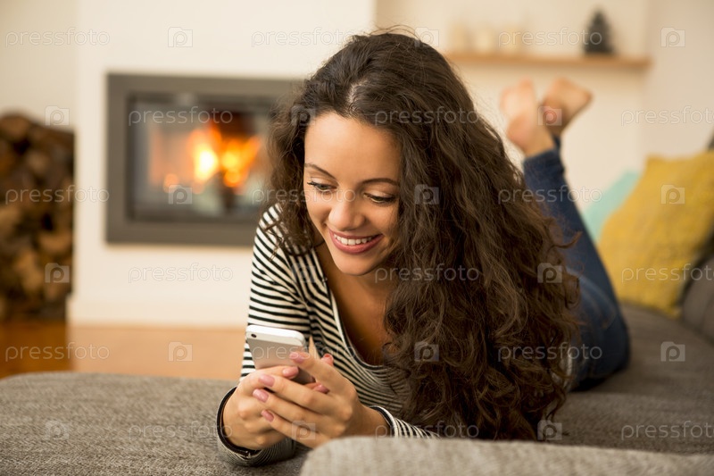 Женщина с ее сотовым телефоном дома