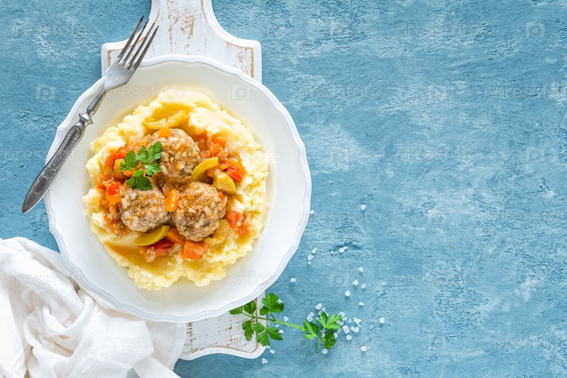 Фрикадельки в овощном соусе с картофельным пюре