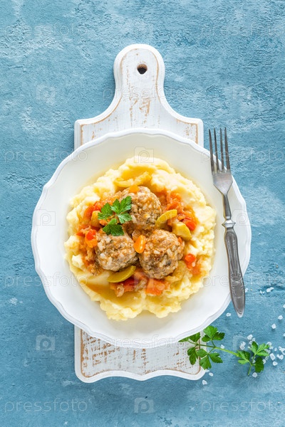 Фрикадельки в овощном соусе с картофельным пюре