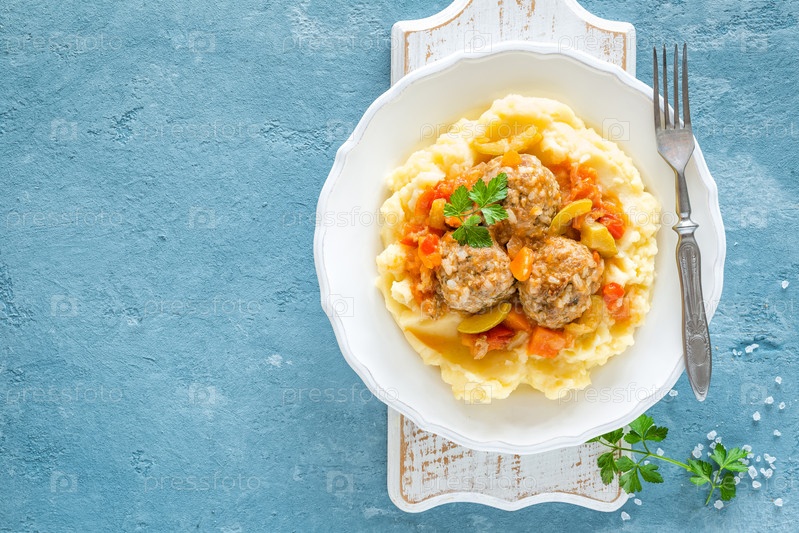 Фрикадельки в овощном соусе с картофельным пюре
