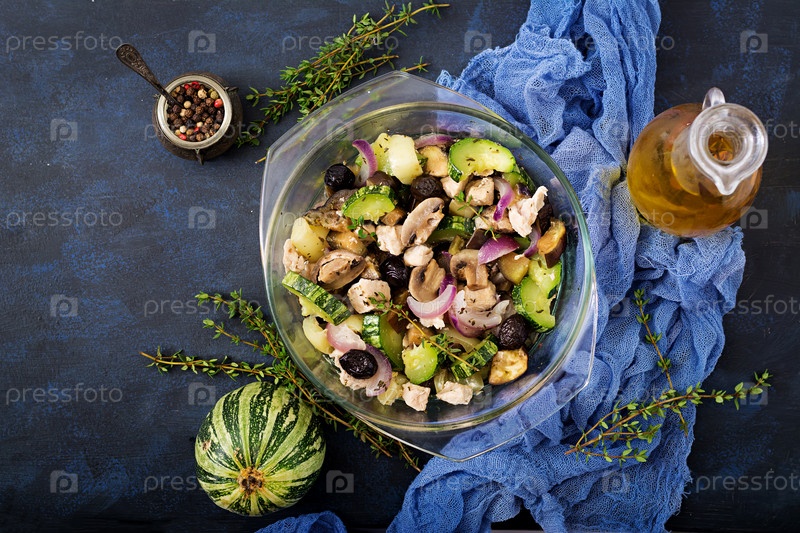 Нежные кусочки куриного филе с цукини и грибами, тушеные с итальянскими травами