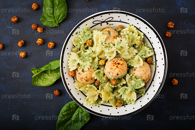 Макароны с фрикадельками и соусом из шпината с жареным нутом