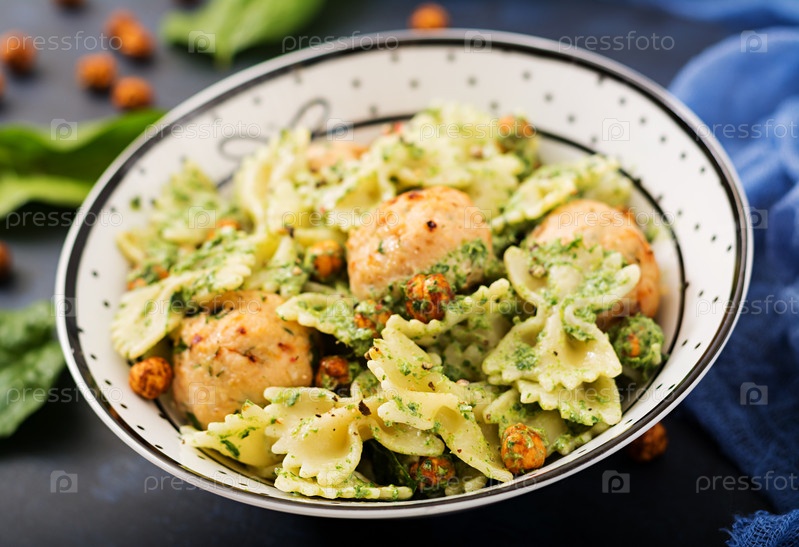 Макароны с фрикадельками и соусом из шпината с жареным нутом