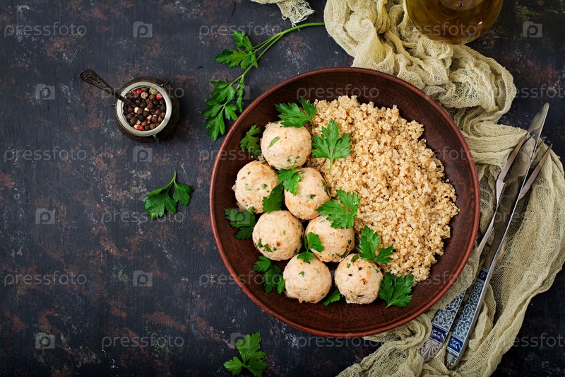 Запеченные фрикадельки из куриного филе с гарниром из лебеды