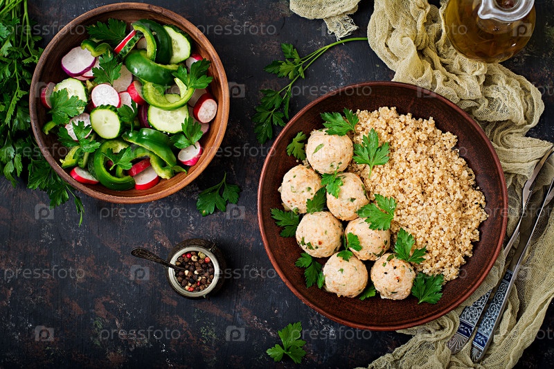 Запеченные фрикадельки из куриного филе с гарниром из лебеды