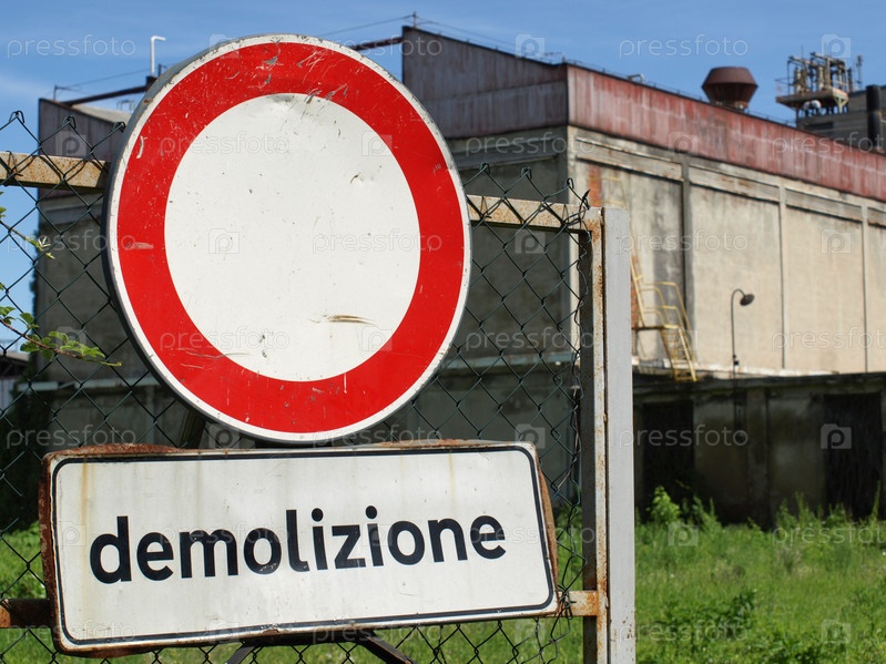 Знак перед разрушенным зданием
