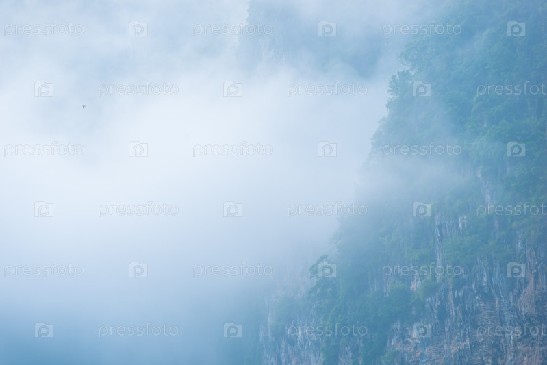 Густой туман охватывает горный лес в Таиланде