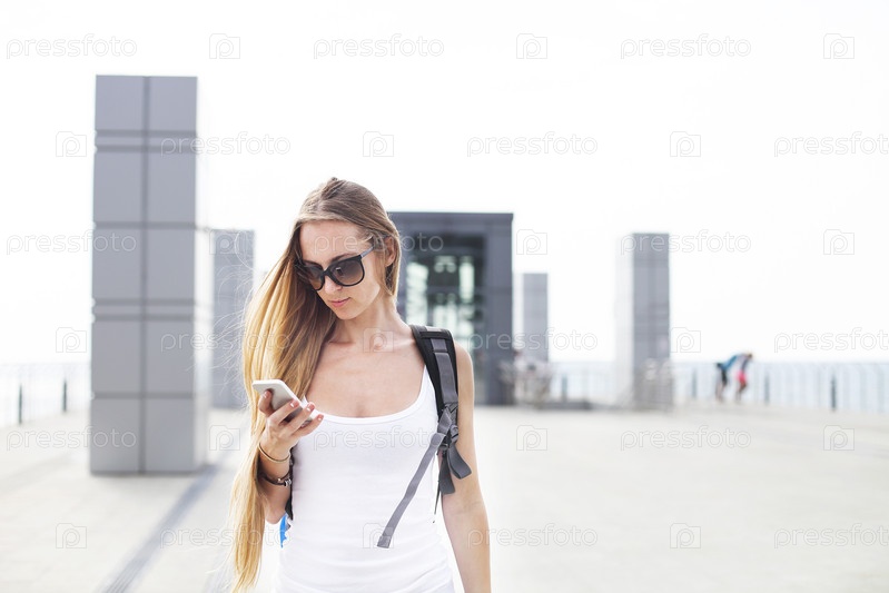 Молодая девушка путешественник с рюкзаком глядя на телефон