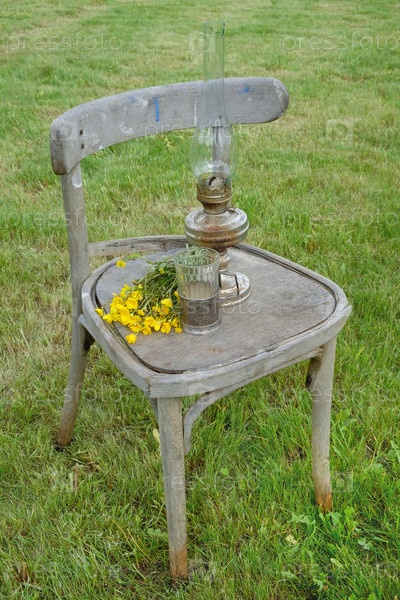 Керосиновая лампа, стеклянный стакан и букет цветов на старом стуле