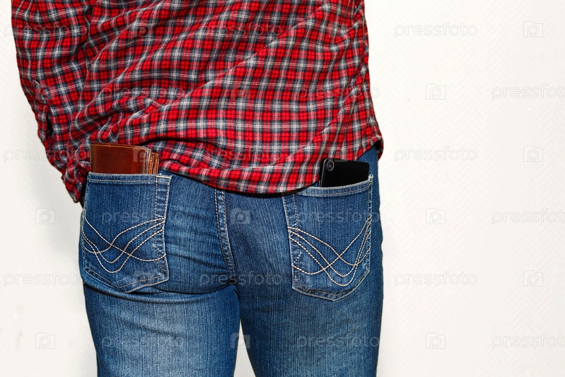 Человек в клетчатой рубашке с деньгами в заднем кармане