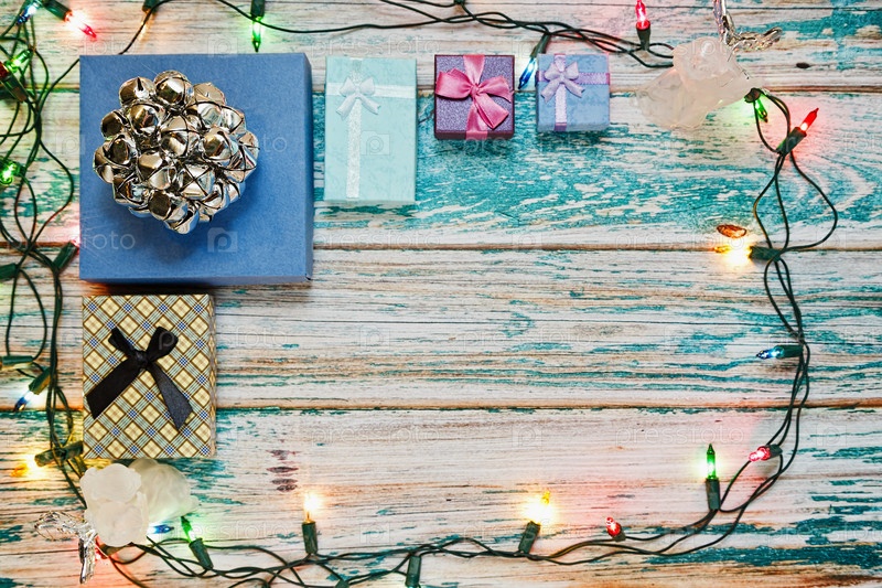Подарки и украшение на деревянном столе