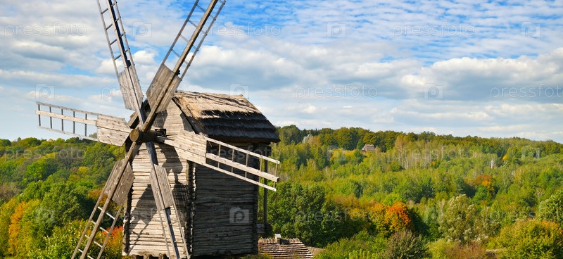 Старая деревянная мельница в поле и небо