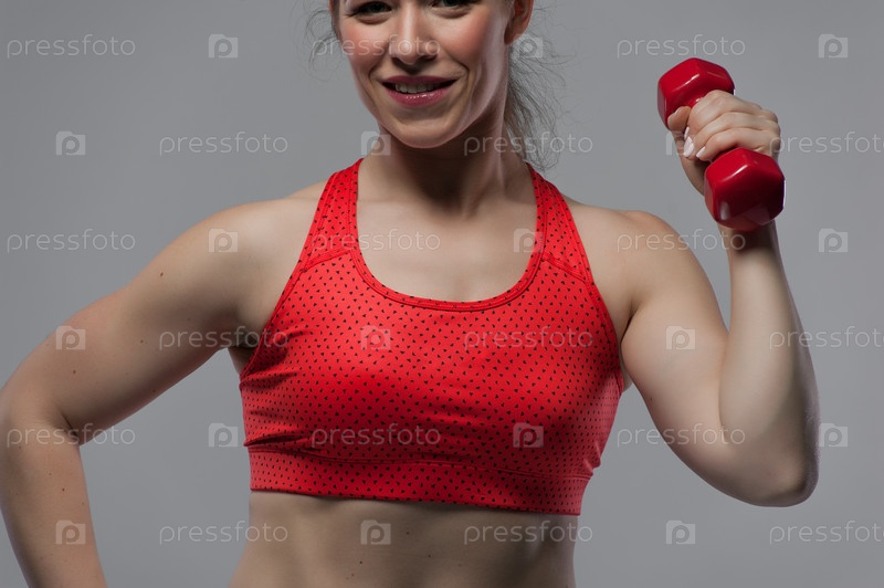 Спортивная девушка с красной гантелей