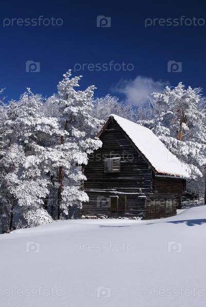 Деревянный дом зимой в горах