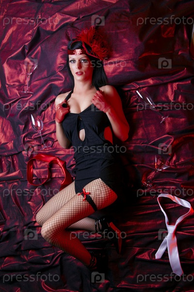 Танцовщица кабаре в костюме в стиле 30-х годов лежит в постели