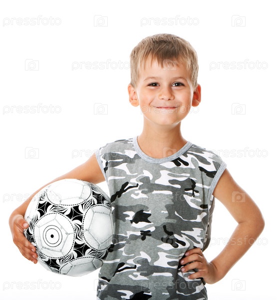 Мальчик держит футбольный мяч, изолированный на белом фоне