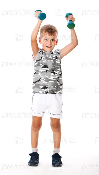 Мальчик держит гантели, изолированный на белом фоне