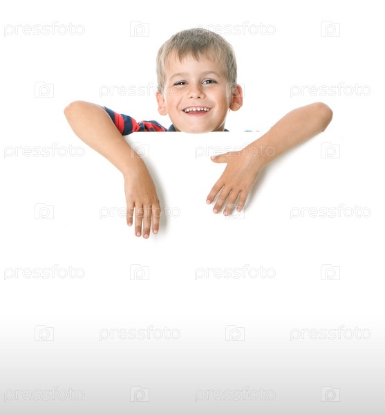 Мальчик с плакатом, изолированный на белом фоне