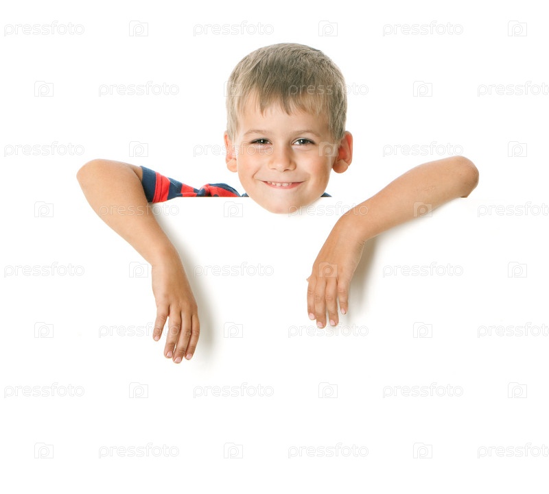 Мальчик с плакатом, изолированный на белом фоне