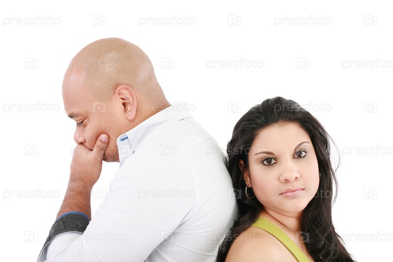 Молодая пара стоит спиной к спине на белом фоне. Проблема в отношениях