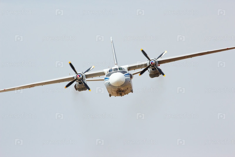 Российский военно-транспортный турбовинтовой самолет Ан-26 в облачном небе