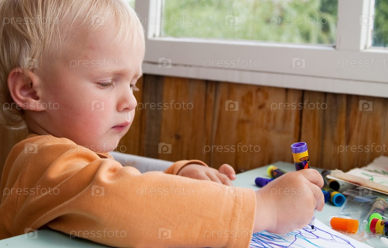 Белокурый малыш рисует фломастерами