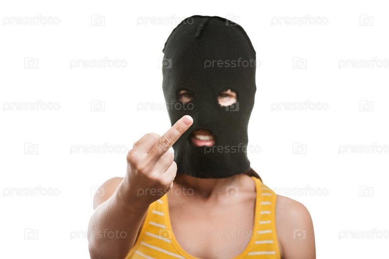 Символ протеста или бунта. Девушка в балаклаве или маске на голове показывает неприличный жест