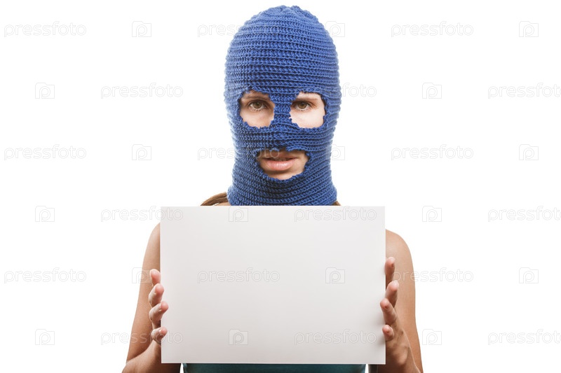 Символ протеста или бунта. Девушка в балаклаве или маске на голове держит в руках чистый белый лист бумаги