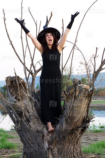 Ведьма обращается к небу, стоя на дереве, Хэллоуин