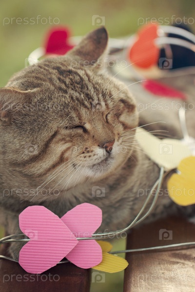Кошка сидит в разноцветных сердцах