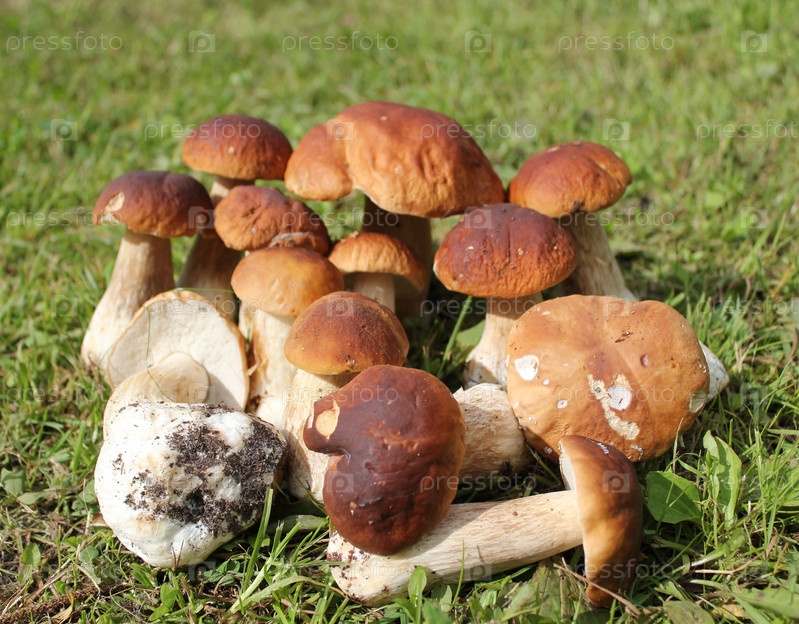 Группа съедобных грибов на зеленой траве