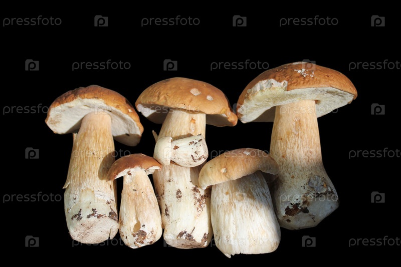 Группа съедобных грибов на черном фоне