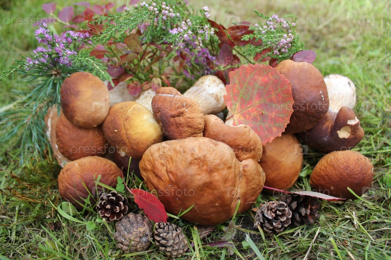 Группа съедобных грибов на траве