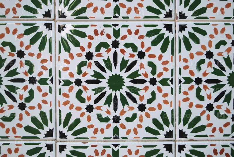 Фрагмент красивой арабской керамической плитки с зелен-красным орнаментом. Махдия, Тунис