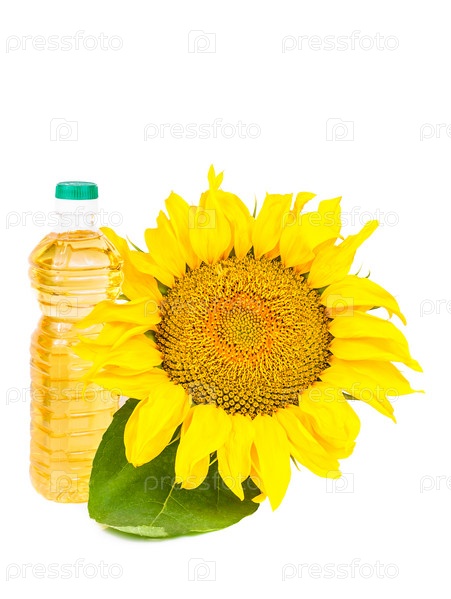 Цветущий подсолнух и бутылка растительного масла