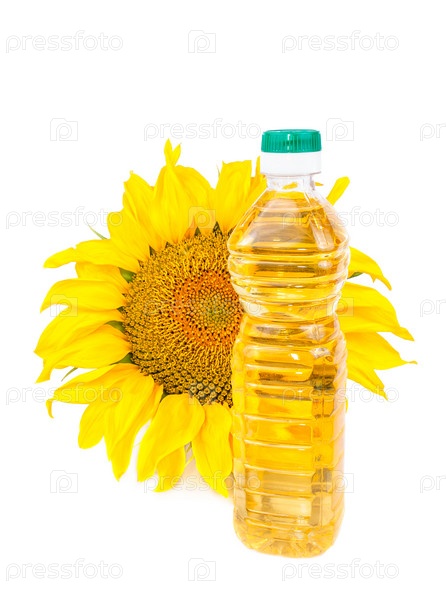Цветущий подсолнух и бутылка растительного масла