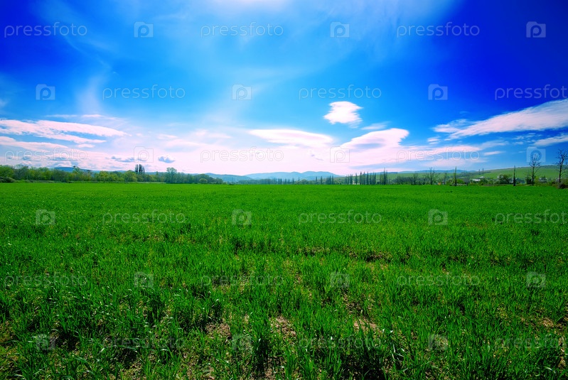 Весенний день. Поле пшеницы и горы на заднем плане