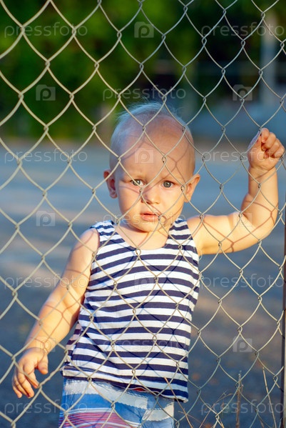 Грустный мальчик смотрит из-за забора