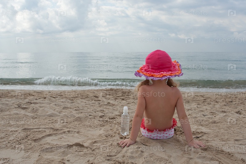 Маленькая девочка на пляже наблюдает за морем