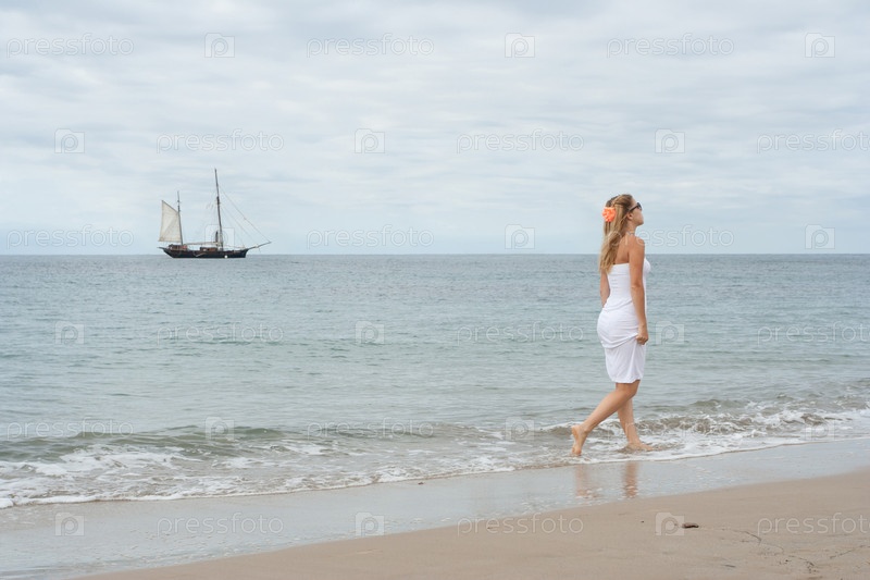 Девочка в белом платье на побережье и старый корабль на заднем плане