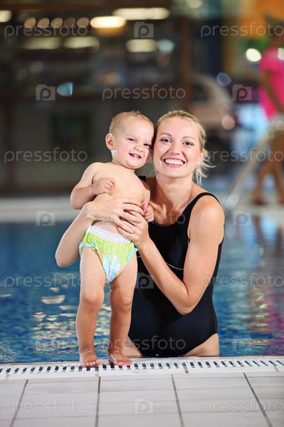 Веселая молодая мать и маленький сын в плавательном бассейне