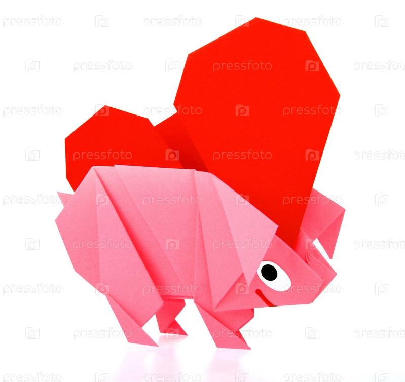Концептуальный образ благотворительности и материальной поддержки. Свинка-оригами и сердце-оригами