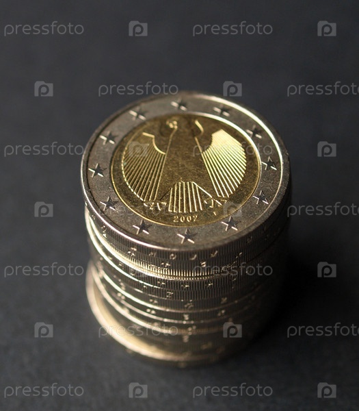 Стопка немецких евро достоинством 2 единицы на черном фоне